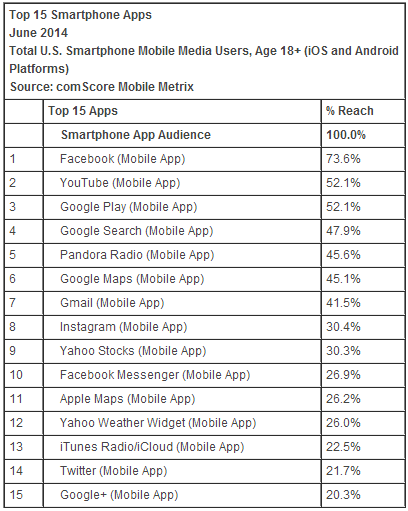 Facebook ranked as the top smartphone app, reaching 73.6 percent of the app audience, followed by YouTube (52.1 percent), Google Play (52.1 percent) and Google Search (47.9 percent).
