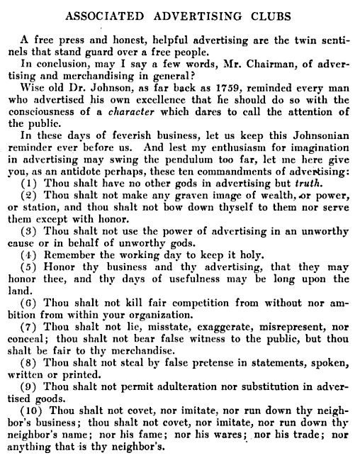 In 1911, the Associated Advertising Clubs issued the Ten Commandments of ethical advertising, and the first Commandment was unequivocal: "Thou shalt have no other gods in advertising but truth." (The italics are theirs, not mine.) Shortly thereafter, the Postal Act of 1912 required that advertising content be differentiated from editorial content. Together, these two actions established one of the most basic tenets of advertising ethics: That consumers must know when they are seeing advertising and not mistake it for editorial content. This is as true in the pages of newspapers as in the tweets and posts of your customers.