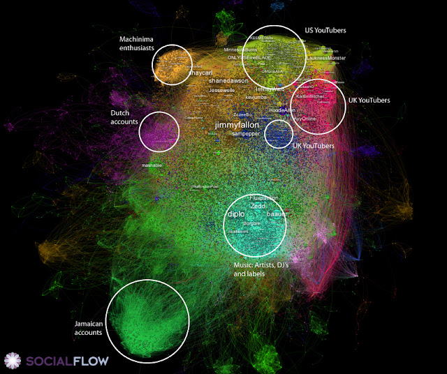 After a similar analysis on the following two days (Feb 9 and 10) different communities can be seen emerging, resulting in a much more tightly knit graph structure. While the same dense cluster of musicians and DJs (in turquoise) still exists, there are substantially more self-identified YouTubers both across the US and the UK. At the same time there's a significant gamer / machinima cluster that's also participating, as well as a growing Jamaican contingent, and quite a few dutch profiles (purple -- left). Additionally, we see various celebrity and media accounts who caught on to the meme -- @jimmyfallon, @mashableand @huffingtonpost. By capturing the two snapshots, we can also make sense of the evolution of the meme as it becomes more and more visible. At first, loosely connected communities separately humored by the videos. Within days, we see major media outlets jump on board, and a much more intertwined landscape. We see different regions in the world light up, and identify communities of important YouTube enthusiasts who effectively get this content to spread.