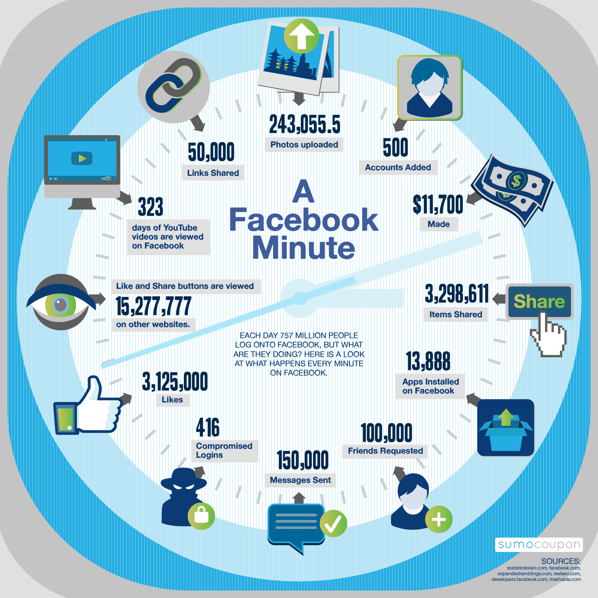 In one minute of Facebook, 243,055 photos are uploaded by users, 100,000 friends are requested, 13,888 apps are installed, 3,298,611 items are shared, 50,000 links are posted and 15,277,777 like and share buttons are viewed on other websites.