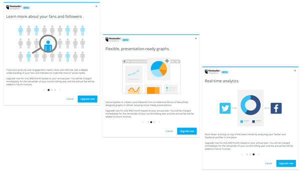 As the dialog boxes say, boards is a dashboard and report building tool. It's designed to track posts by user engagement, reach, clicks and referrals to get a deeper understanding of your fans and followers. Hootsuite also says you can use boards to deliver social media presentations. The cost of Boards it $40 per month if upgrading from Hootsuite Pro on the annual plan, or $60 per month if you're paying monthly.