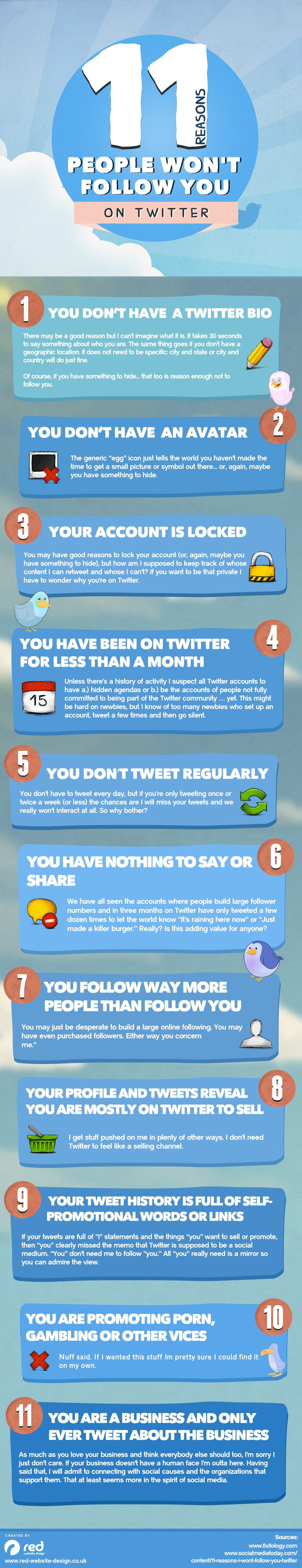 We share 11 reasons people won’t follow you on Twitter in this infographic.