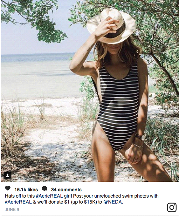 Aerie is a women’s clothing company, and they recently ran a user-generated social media campaign in which they asked their female customers to post natural, un-retouched bathing suit selfies on Instagram.