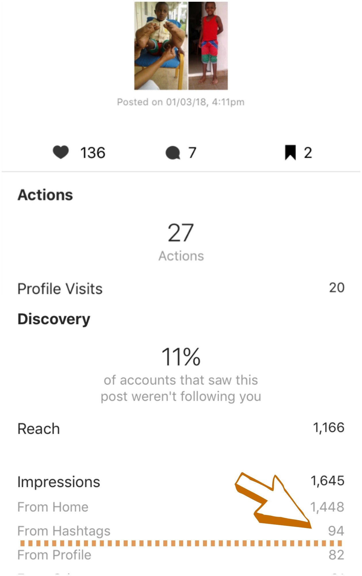 Profile visits, reach, followers, and actions have all been available for your monthly social media reports. Now, insights for business profiles just got even more interesting. You can view insights on a post, swipe up, and view more in-depth information on how your post was discovered, including (you guessed it) hashtags.