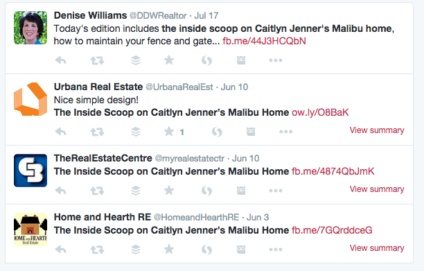 Not long ago, while checking out my Twitter feed, I realized at least 10 successive individual Twitter users posted the same exact content - at the exact same time. To make sure they weren't spam accounts, I checked out their profile links to their websites. They were real individual Realtors or brokerages.