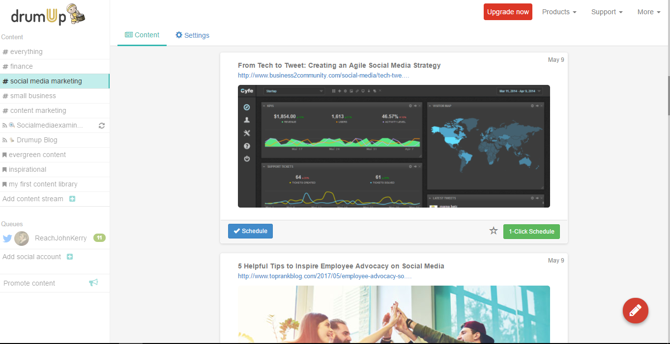 DrumUp is a social media tool that helps curate interesting posts that your fans and potential partners are likely to appreciate. Using DrumUp, you can curate relevant content for everyday use by setting up keywords and RSS feeds.