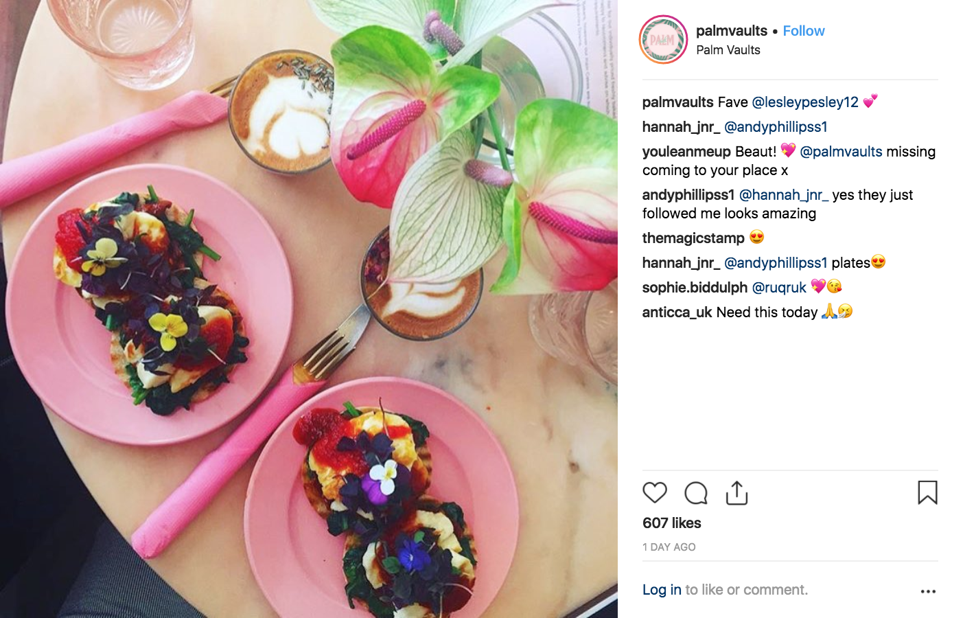 In London’s hip borough of Hackney, you’ll find Palm Vaults, a cafe which has fully grasped the benefit of providing maximum Instagram opportunity. Potted plants hang over marble tables, full of pastel-colored lattes and flower-topped granola. Its an influencer’s paradise and in attracting them, the business receives plenty of free advertising.