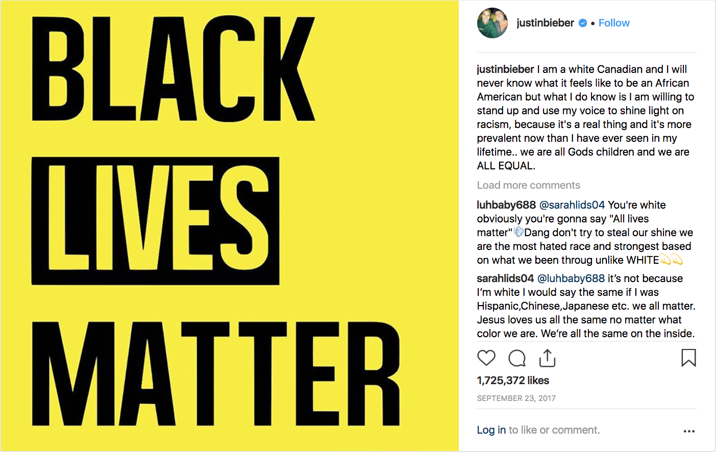 Imagery is incredibly powerful, and many activists now use Instagram as a storytelling device to spread their message far and wide, inspiring others to get involved. It also gives influential individuals direct access to their followers to deliver undiluted messages of support - like Justin Beiber’s Insta announcement of his support for the #blacklivesmatter movement.