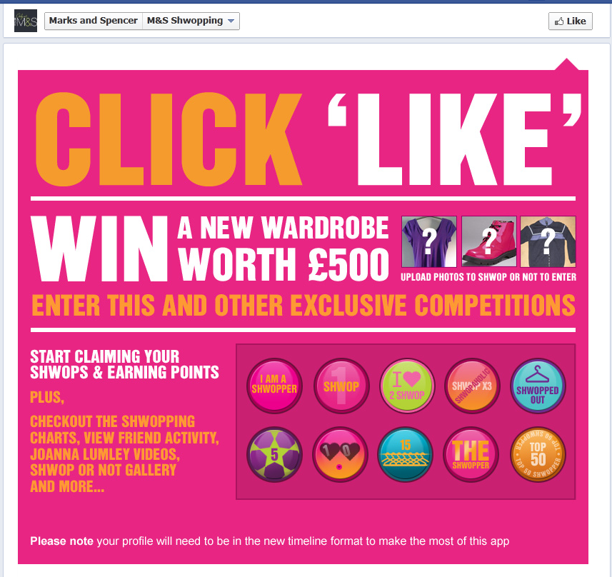 Apps and promotions: M&S is running a recycling clothes campaign (M&S Schwopping) and there was a well thought-out content strategy across the page, in terms of videos and a series of status updates. A promotion for a live chat with Joanna Lumley was well managed: questions asked beforehand and the recording provided afterwards.