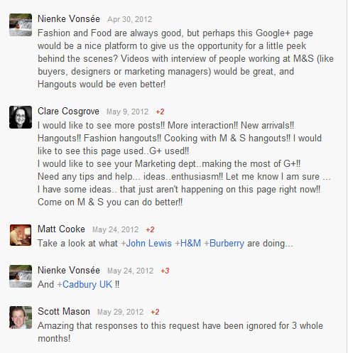 The other retailers are finding themselves being criticised by users for setting up the presence and then not doing much with it. M&S appears to have forgotten it set up the account: the last post is Feb 24 with comments criticising the brand for its neglect and comparing it unfavourably with its competitors on Google+. Oops.