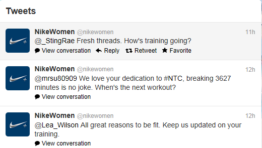Nike: @NikeWomen is of necessity a more reactive Twitter account as there are so many inbound messages: women, it seems, just love to tell the brand what they are doing training-wise. Much of the time @NikeWomen was replying rather than initiating conversations: over a 10 day period, I spotted about four 'marketing' tweets only - but even then, there was no hard sell, just running and eating tips. A really engaged, friendly account, very much focused on the brand's raison d'etre.