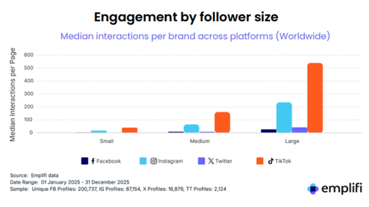 First, in terms of audience growth, Emplifi’s data shows that brands saw the biggest growth on TikTok, where median brand follower counts rose by more than 200% year-over-year in 2025.