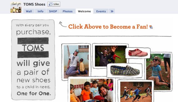 Example 3: The TOMS Shoes Facebook page will keep the image that says "With every purchase. TOMS will give a pair of new shoes to a child in need. One for one". A Facebook spokeswoman confirmed that this was in a description area rather than a box and would not be going away. She added that Tom's also had this information on the "Welcome" tab, which was an FBML tab, and would remain. (This last example will also be impacted by Facebook's simultaneous change of panel width to 520px wide)