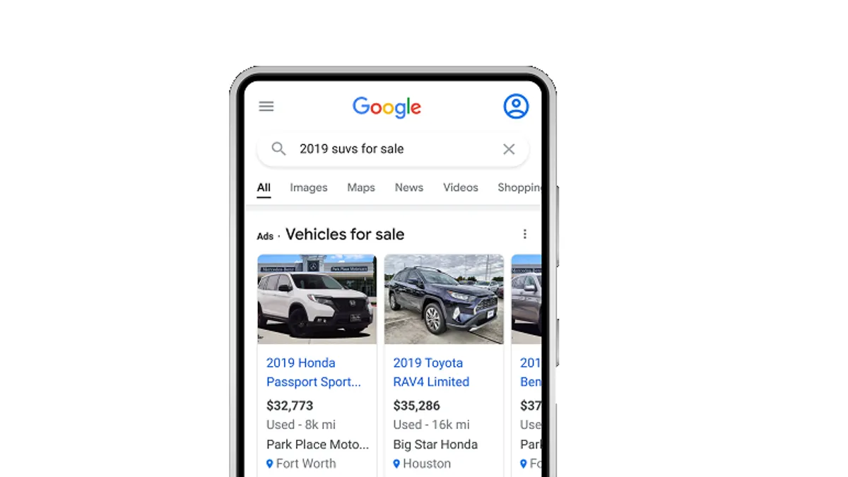 “For example, if someone searches for a 2019 SUV, they’ll see several vehicle options they can either purchase nearby or get delivered - along with pictures and inventory information like location, make, model, price and mileage. Once they select a car, the ad will direct them to the vehicle description page on your website where they can fill out a lead form or get your dealership’s contact information.”