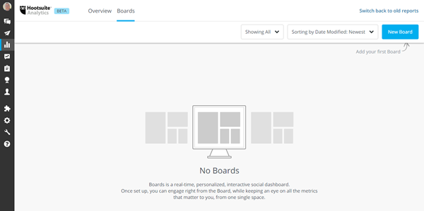 As the dialog boxes say, boards is a dashboard and report building tool. It's designed to track posts by user engagement, reach, clicks and referrals to get a deeper understanding of your fans and followers. Hootsuite also says you can use boards to deliver social media presentations. The cost of Boards it $40 per month if upgrading from Hootsuite Pro on the annual plan, or $60 per month if you're paying monthly.