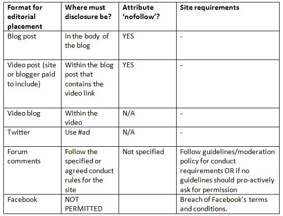 3. The fact that the requirements extend to consideration of search and use of 'nofollow' (Google and many other search engines require paid for links to be designated by adding rel="nofollow" attribute to the tag; again this is based on the principle that payments for content should be disclosed);