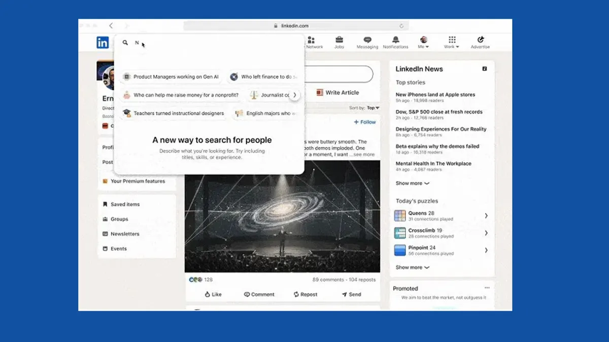 Though people is the focus, and I'm not sure what results you'll get on the other elements. As you can see in this example, now, LinkedIn’s search bar will be able to provide results based on basically any criteria that you enter into the prompt.