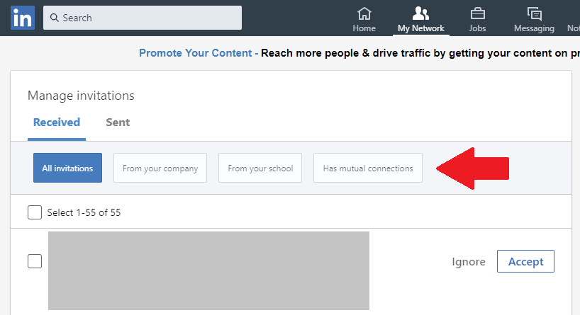 First, click on "My Network" at the top of the page. That will bring up all your inbound invitations from people who want to connect with you.