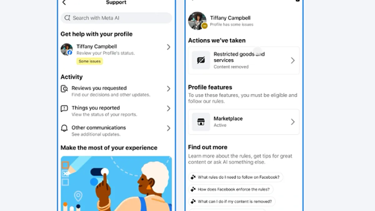 “Getting help with your account should be simple and accessible. That’s why we’re launching a new, centralized hub on Facebook and Instagram that brings support tools and options into one place. Within the support hub, you can now report an account issue, find quick answers with the help of Meta AI-powered search, and more.”