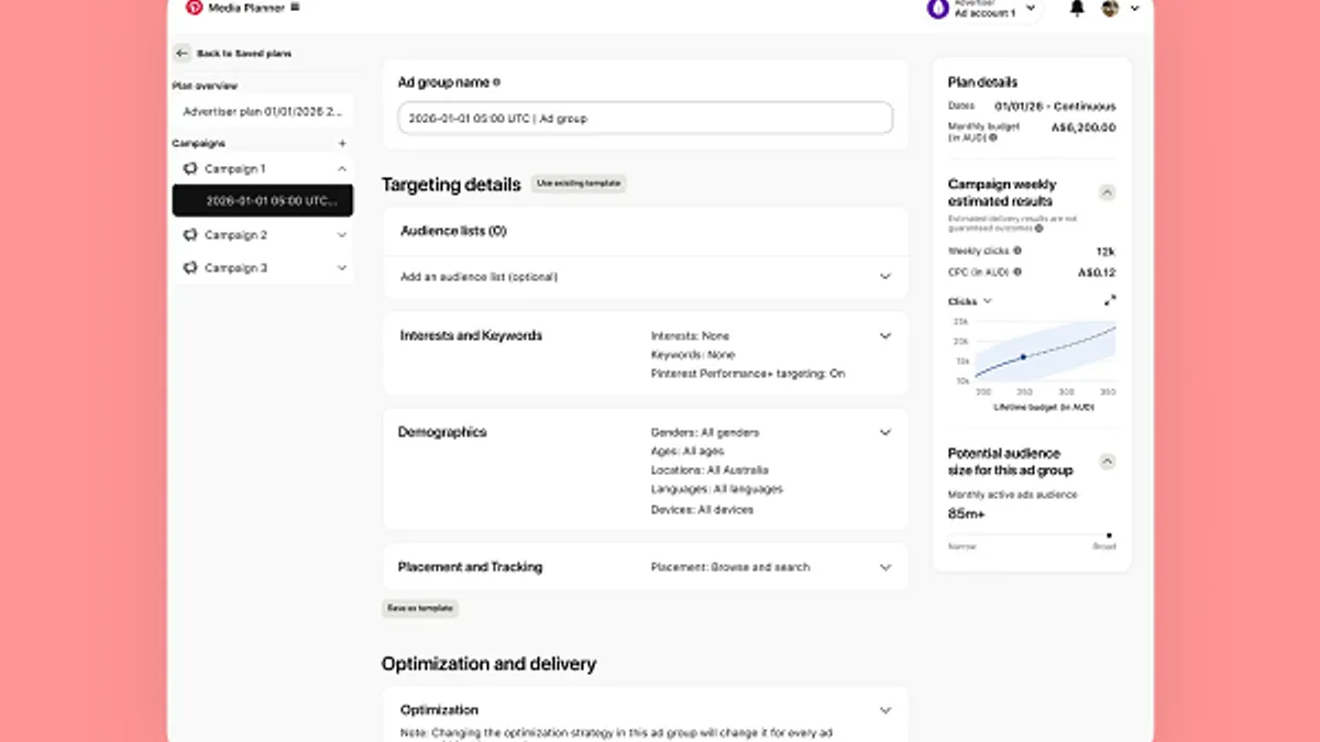 “The Pinterest Media Planner is built directly into the Ads Manager, giving you a single place to plan upper-funnel campaigns without needing any additional tools or manual modeling on spreadsheets.”