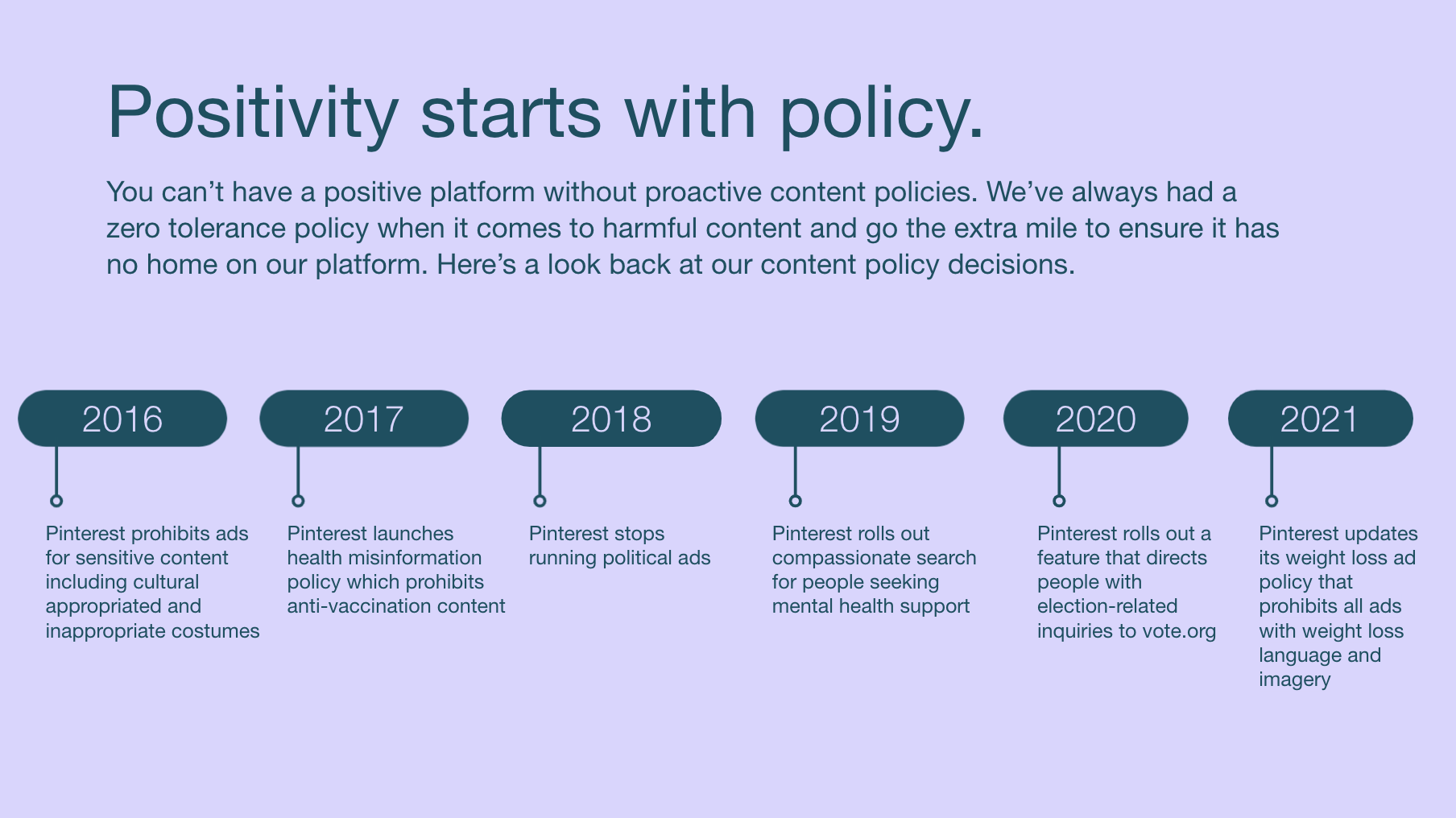 To encourage others in the industry to join the movement towards brand and consumer safety, Pinterest is emphasizing the importance of appropriate policy-making by communicating their own timeline of action and commitment to future steps.