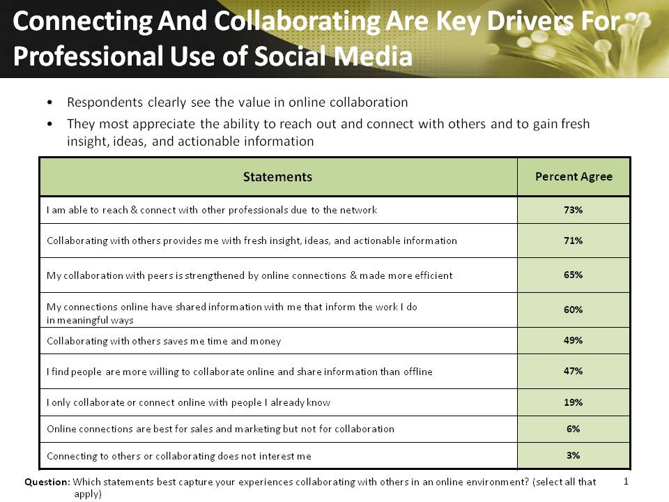 Our research data strongly suggest that professionals use social media tools with the express desire of connecting and collaborating with others. Their goals include gaining access to information they cannot easily find elsewhere and efficiency when working with peers across geographical and time boundaries.