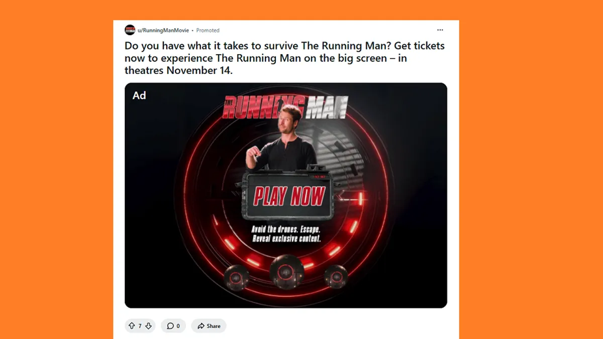 As you can see in this example ad for the upcoming film “The Running Man,” Reddit’s interactive ad units provide an attention-grabbing upfront image, which invites users to tap through to interact with the promotion, and in this case, play a mini-game in-stream.