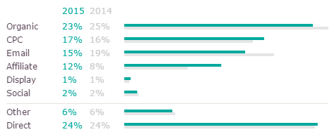 Custora finds social drives small fraction of sales compared to organic search, PPC and email: Custora tracked 100 million anonymized shoppers, $40B in e-commerce revenue, and 100+ online retailers in January 2015. It found that social media delivers just 2% of ecommerce sales. This figure is 91% less than organic search, 88% less than CPC and 87% less than email. Custora's data was no different over the holiday period. In its E-Commerce Pulse 2014 Recap, the company notes, "Similar to the trends last holiday season, and throughout 2014, social media (including Facebook, Twitter, Instagram, and Pinterest) is still not driving a substantial share of e-commerce transactions. Through the holiday season (November - December 2014), social media drove only 1.9% of all e-commerce orders - a similar share to holiday 2013, when it drove 2.3%." (Source and source)