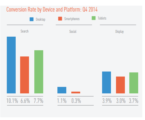 Once the folks who click on those ads arrive on your site, social conversion rates are downright dismal. Compared to social ads, display advertising's conversion rates are 255% greater on mobile and 900% more on smartphones. Social advertising conversions fare even worse against search ads; search ads deliver conversion rates 818% higher on desktops and 2100% greater on smartphones versus social ads.
