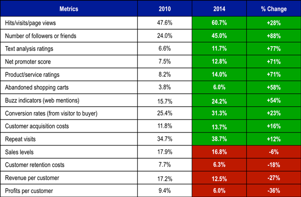 Even more concerning, there has been a decrease since 2010 in the number of marketers using bottom-of-funnel social media metrics such as Sales Levels, Revenue per Customer and Profits per Customer. Marketers are ignoring the most powerful metrics in order to focus on the ones that are easiest to collect (and to manipulate). (Source)