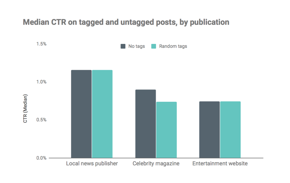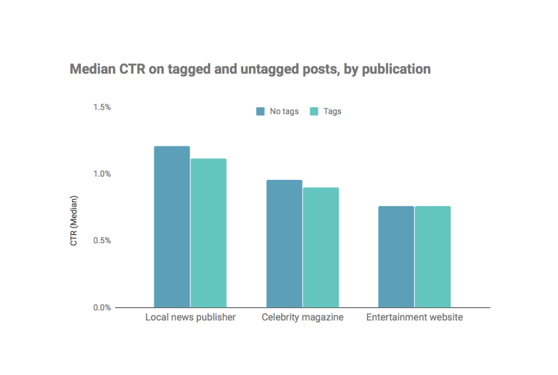 The results were both clear and consistent - none of the publishers’ Pages saw a statistically significant increase in CTRs when interest tags were added to their posts, suggesting that tagging did not achieve its main aim of directing posts to an audience more likely to be interested in the publisher’s content. One of the Pages even saw a statistically significant decline in its CTR, as impressions increased while traffic held steady.