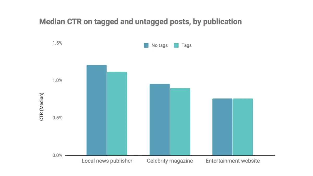 However, following initial excitement, no definitive independent study ever managed to establish whether adding interest tags to organic posts had any positive impact on traffic or engagement. Using extensive data from publishers’ Pages with millions of followers, we are now able to provide clear evidence that adding interest tags does not lead to an increase in click-through rates (CTRs), suggesting that audiences reached by carefully tagged posts are no more likely to click on a link share than audiences reached by posts without tags.