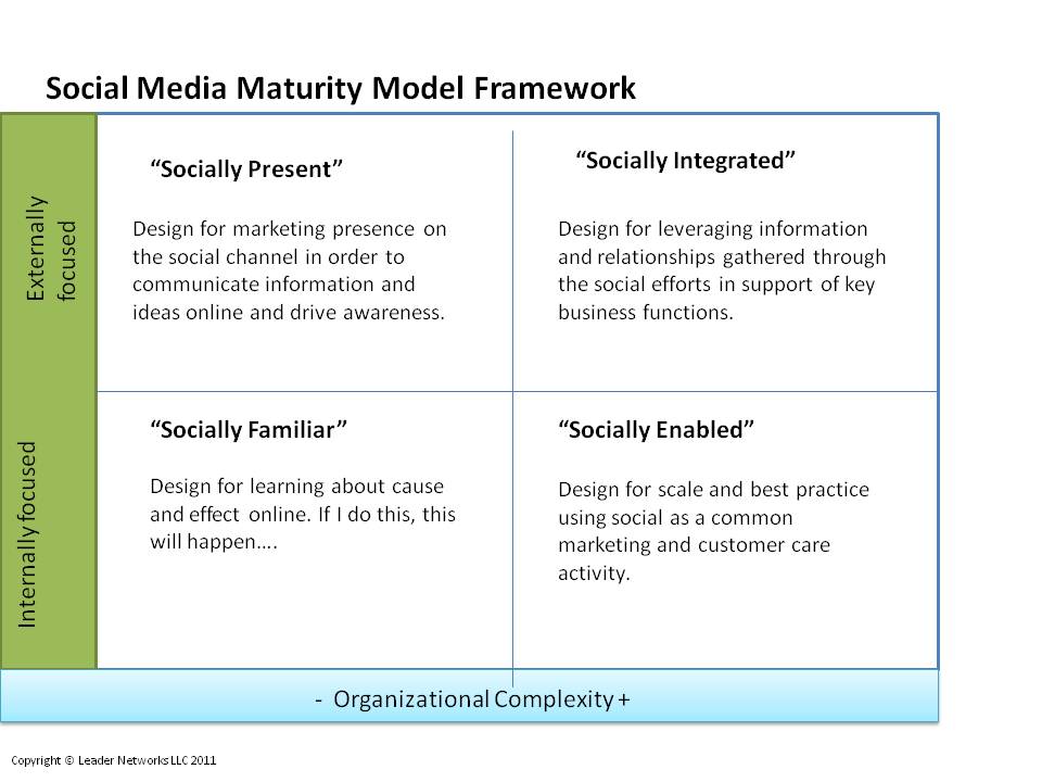 So here's a preview of my prescription for treating organizational unrest, anxiety and that feeling of unsubstantiated under-performance: the Social Media Maturity Model framework. Tailored to the needs of B2B organizations, I'll be presenting more on this topic at the Digital Impact Conference in NYC next week. This model stems from our research findings and fueled by The Leader Networks Social Business Assessment (a process that helps an organization identify their current and desired maturity level to help them align their operations with strategic intent).