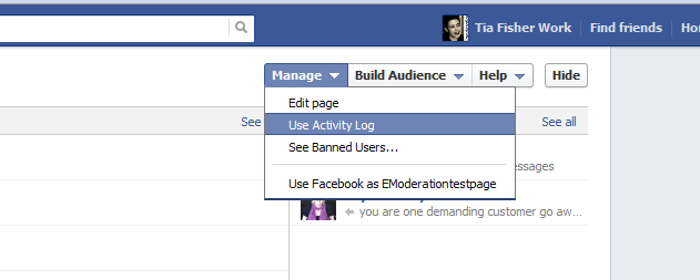 Step 2: Go to the 'Activity Log' by clicking on 'Manage', and on the drop down menu choosing 'Use Activity Log'. Go here to moderate the content on your timeline - check it against your terms and display/hide/delete the content by Page admin or by others. Here you can also check the Page admin activity (useful for teams) and your spam posts.
