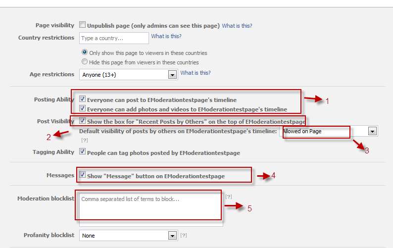 - Moderation blocklist - add words you would like to filter as 'Spam' - for example "http://" which will pick up spam links. Facebook also offers 2 inbuilt levels of profanity blacklist medium/strong (though we've never seen the lists to say what is blocked).