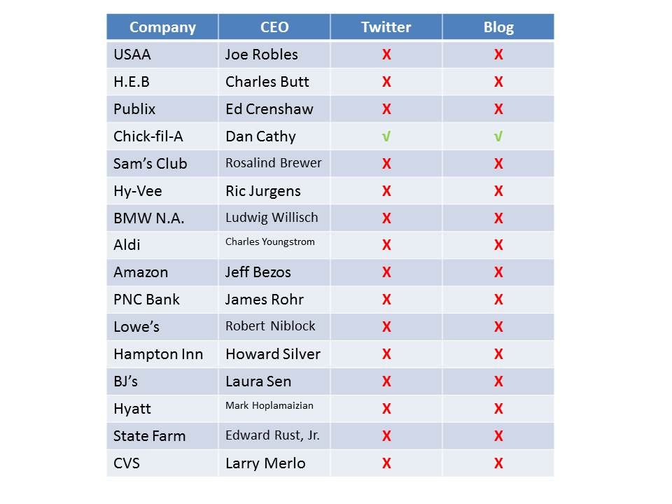 I took a look at the top sixteen distinct logos, their CEO by title and searched for social web presence of each. I focus on twitter and blogs in this search. I didn't look at whether any chief executives where engaging in customer dialog on Facebook fan pages, owned media or other such community forums. In my search, I did find video clips of several executives on YouTube. But, they were all news clips or other such media, not what I would call personal engagement.