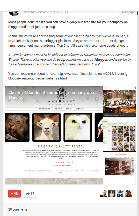 This Google+ post received 48 +1s to the original post, 17 shares, and 28 comments (at the time of this posting). In addition, the shares by community also received +1s and re-shares.