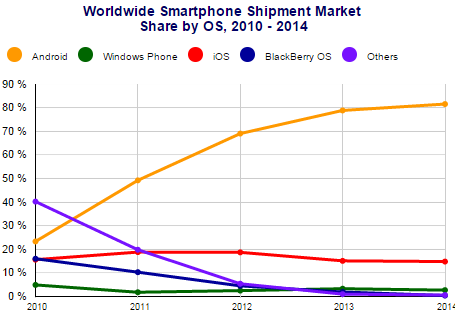According to the latest market study by International Data Corporation (IDC), Google Android and Apple iOS accounted for 96.3 percent of all smartphone shipments -- that's up slightly from 95.6 percent in 4Q13.
